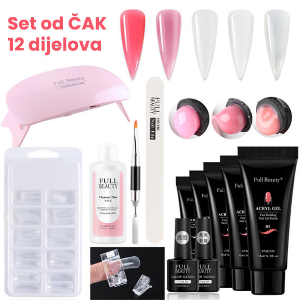 ✅ ČAK 12 dijelova (profi alati, UV lampa, premium gelovi, štipaljka, kalupi itd.)